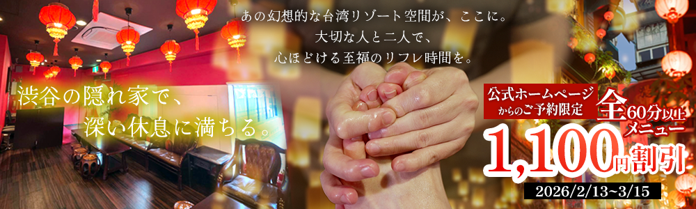 装いを新たに、これまで以上の心地よさを。【渋谷店リニューアルキャンペーン】実施中! 2026年2月20日リニューアルオープン!2/13より3/15まで【渋谷店リニューアルキャンペーン】実施中! 新しく生まれ変わるウーライで、特別なひとときを。 リニューアルオープンに向けて、 60分以上の全コースが【1,100円OFF】 でご利用いただける 期間限定キャンペーンをご用意しました。 20年以上の実績に裏打ちされた本場台湾式の技術と、本場台湾を感じる店内、完全個室のプライベート空間をぜひこの機会にご体感ください。クーポンコード欄に「リニューアル」とご記載下さい。
